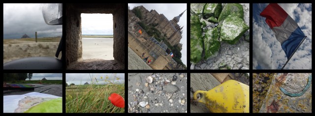 Ma qui, ad Arromanches, c'è molto altro che non lascia solo impressione. Il bianco e nero si fonde con te e ti svuota. Ma calma. Andiamo piano. Intanto una cosa graziosissima: rincontro le tre coppie di motociclisti francesi: ci salutiamo con un sorriso più vivido questa volta. E nel parcheggio ci sono tante moto. Forse è il sole. Forse anche qui come da noi sulle Alpi, come c'è il sole si esce in moto. Non lo so. Ma mi piace leggere le targhe, inglesi, tedesche, francesi e anche italiane. Sono sempre felice quando ne leggo una. Quella “I” è stupenda! Prima di partire cercavo un adesivo della bandiera italiana da mettere sulla targa della mia motina: volevo con me la mia bandiera. Non ne ho trovato mezzo. Forse nemmeno sapevo dove comprarlo. Ma fa lo stesso: ho il mio braccialetto. E ogni tanto lo guardo.