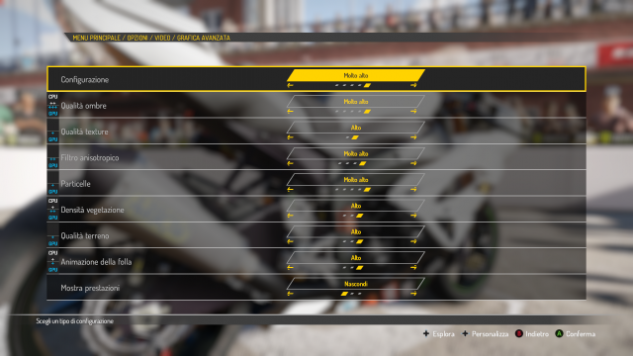 Due mappature predefinite (una più per l'arcade e l'altra più per una guida sim), più una parzialmente personalizzabile (gli stick e i grilletti sono bindati).