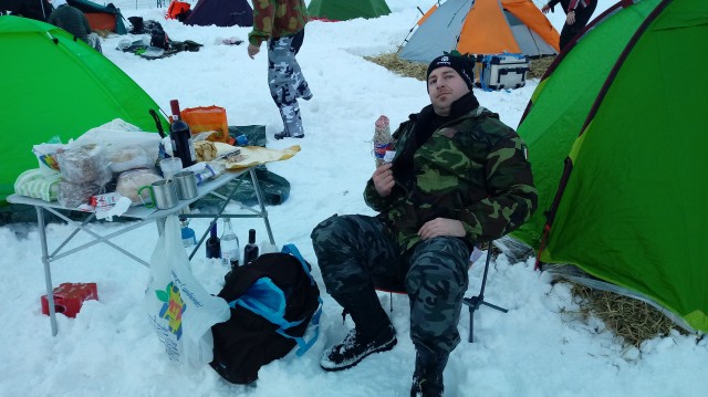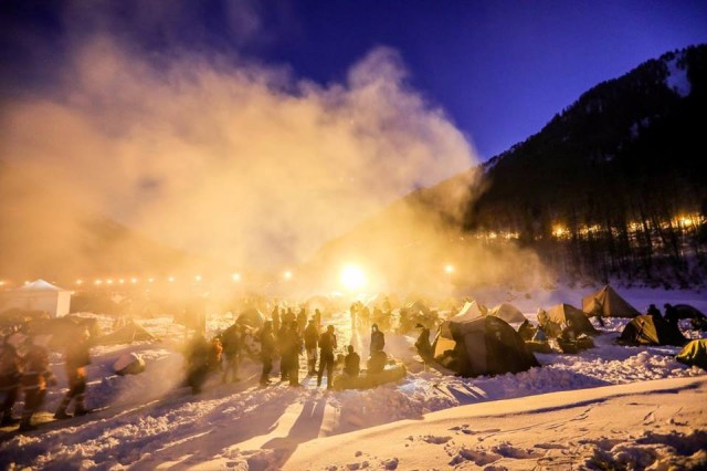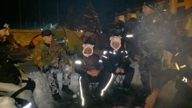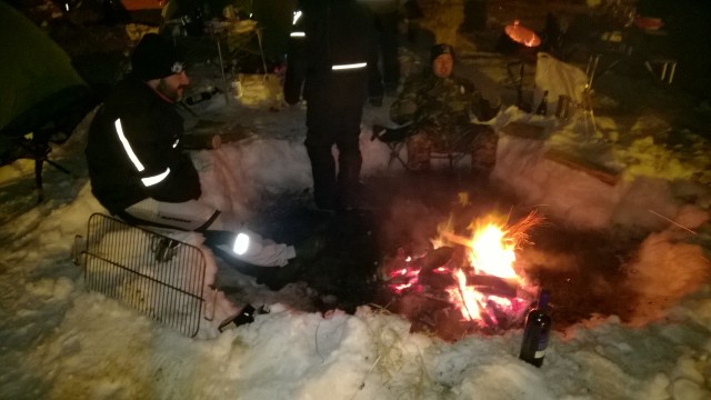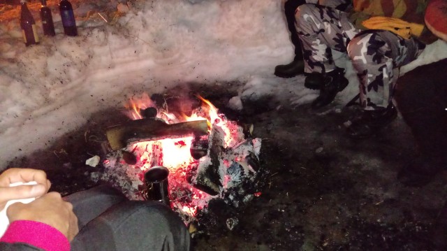 , personalmente non ho chiuso occhio a parte un oretta. Verso le 7 comincia il lento risveglio a circa 9 gradi sotto zero e ci godiamo il sole che spunta da dietro i monti, chiaramente il fuoco si è spento e pensiamo bene di bruciare la paglia, gran bel fuoco ma troppo veloce a esaurirsi senza dar tempo di scaldarsi.