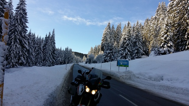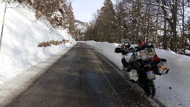 Riprendo la marcia con la strada che si fa sempre più innevata, arrivando al punto in cui… La strada è proprio chiusa…!!