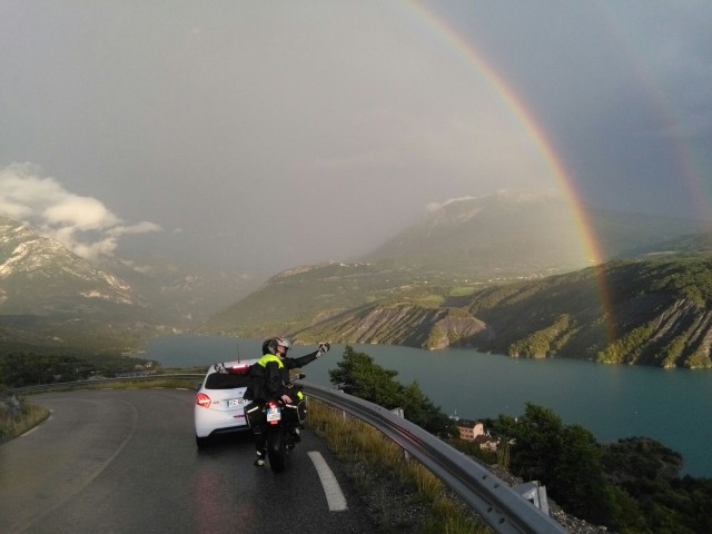 , e quindi rientriamo in Francia alla prima occasione, cioè al Monginevro. Percorreremo la N94 fino al Lac de Serre Procon, dove prenderemo un altro bel temporale che ci regalerà un fulmine vicinissimo e due arcobaleni sul lago, perfettamente semisferici, con le due stremità e tutta la gamma di colori a vista. Spettacolo unico, non lo dimenticheremo mai