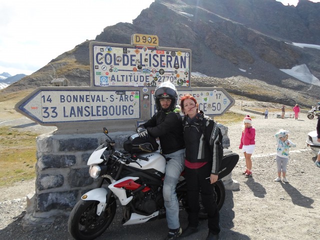 Scendendo verso sud dal Col d' Iseran troviamo anche una motoviaggiatrice in difficoltà, con la catena in mezzo al mozzo. Dopo qualche peripezia, aiutati da due piemontesi raggiungiamo un gommista che ci presta un paio i chiavi per sbloccare la situazione