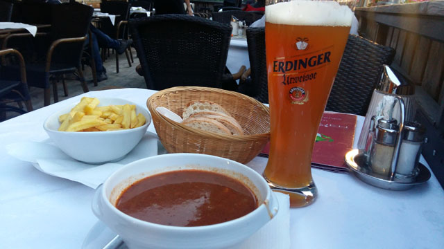 Per cena un bel piatto di gulashsuppe, una porzione di pommes frites ed un'ottima Erdinger: