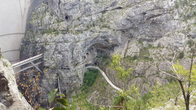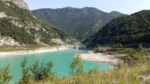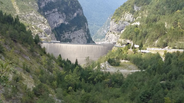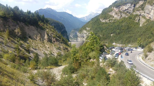 Passato il paese di Erto, mi fermo in uno spiazzo dal quale, in lontananza, si vede la famosa diga del Vajont: