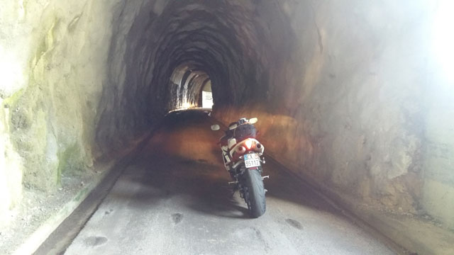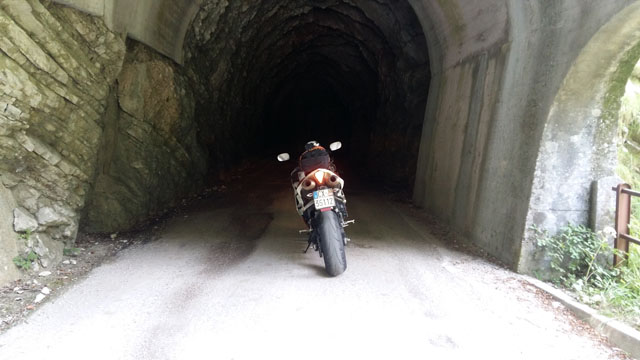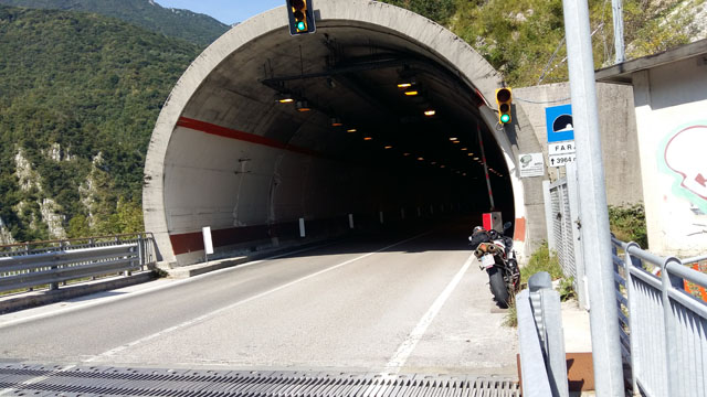Mi viene la mezza idea di fermare la moto in uno degli spazzi che si trovano all'interno della galleria, ma oltre ad essere vietato (ma dai...??!!) sarebbe una mossa troppo sporca.