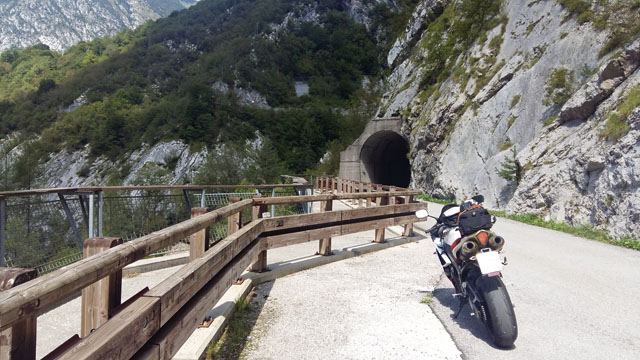 Circa 9 chilometri di strada stretta, a tratti con asfalto rovinato, con qualche ponticello, qualche galleria, curve strette e cieche... Praticamente 'na figata di strada... Alla fine mi ritroverò nuovamente sulla SR251, poco prima del paese di Erto. Eh niente, giro la moto e mi rifaccio nuovamenti 'sti 9 chilometri...