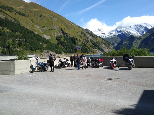C'è un'altra galleria da percorrere e risaliamo in moto. Purtroppo la BMW di Paolo non parte, già alla sosta carburante ci aveva comunicato che la batteria dava segni di cedimento, ora è proprio muta. Tentiamo con una partenza a spinta ma, nonostante lo spolmonamento, niente da fare; siamo nell'unico punto in piano di tutta la Svizzera (il coronamento della diga) e per raggiungere la prima discesa c'è un bel po' da scarpinare