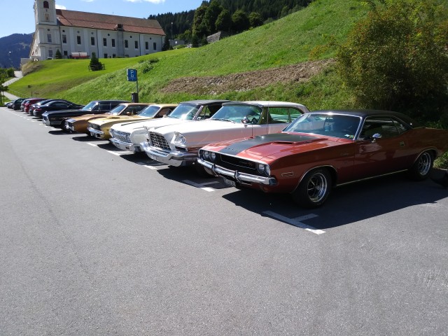 A Disentis facciamo una sosta tecnica e la moto del Vufero si spegne ancora mentre osserviamo ammirati una fila di Dodge Charger e altre enormi auto americane.