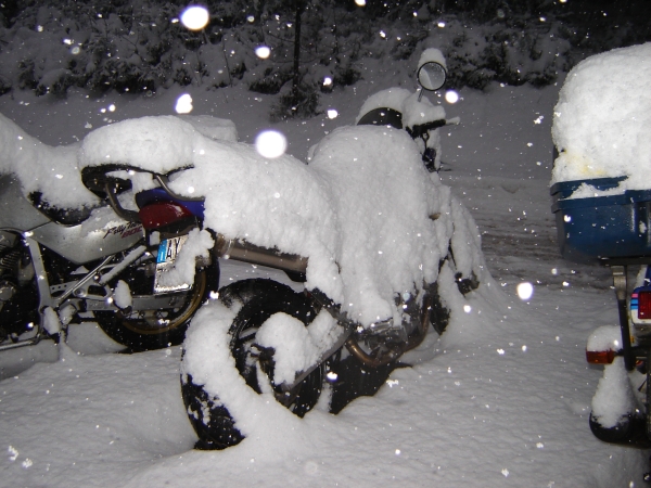de_corsa imita JT e lascia il segno vicino al distributore... ma niente bigfoot stavolta altro brainstorming e si decide tra il rimanere li ed accamparsi... o proseguire verso un posto più sicuro... fortunatamente con le poche batterie rimaste, il navigatori ci fa sapere che a circa un km c'è un albergo... e si opta per quella scelta... ovviamente è stato il km più lungo della mia vita... ci abbiamo messo più di mezz'ora per percorrerlo... e ne sono capitate una per colore... in un tratto in salita fil finisce la benzina e gli si spegne la moto... gira il rubinetto della riserva ma la moto non riparte più... mandrake in avanscoperta trova la gastolf ed inizia a prendere accordi... io avverto JT dell'inconveniente e torno a piedi verso fil... 10a9 che mi aveva preceduto a piedi mi avverte che fil non riesce a ripartire e lui non ce la fa a proseguire... io vado avanti a vedere che fine hanno fatto gli altri e 400 mt dopo li trovo a destinazione... allora mandrake torna con de_corsa e i cavi per far ripartire fil... JT parcheggia in un garage sotterraneo ed aiuta anche me a parcheggiare... nella discesa non riesco a frenare la moto e mi fermo contro un cumulo di neve fresca... che fortunatamente mi ferma senza danno e senza cadere... disincagliata la moto e portata in garage torno a recuperare quella dello sfinito 10a9... e la porto all'ingresso... nel frattempo de_gyver e mandrake fanno ripartire fil... che provvede subito a far rispegnere la moto ingranando la prima col cavalletto giù... fortunatamente riparte da sola e con JT che spinge anche fil arriva a destinazione... sfatti e sfiniti arriviamo al caldo ed ad una cena ristoratrice... a mezzanotte e 20... e dalle 19 e 30 avevamo percorso una trentina di km scarsi...