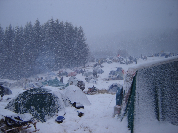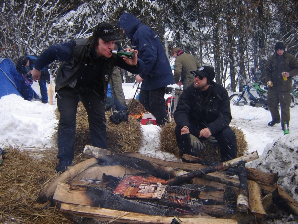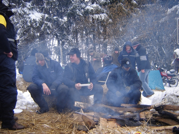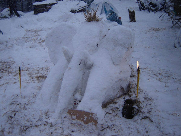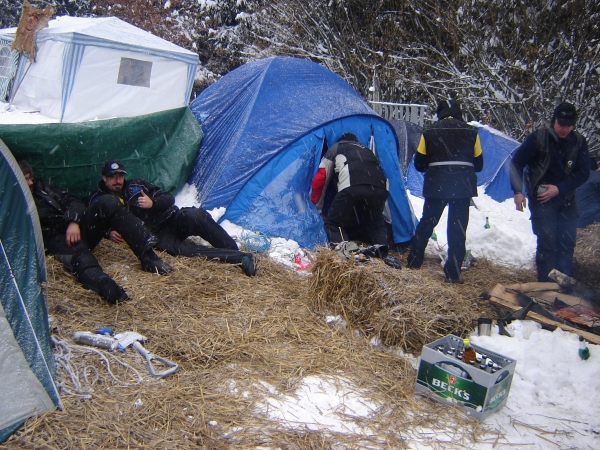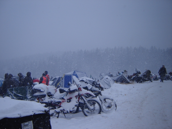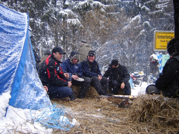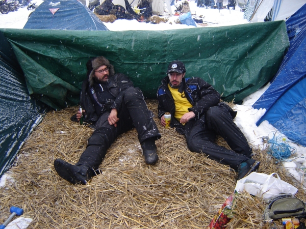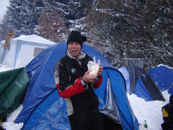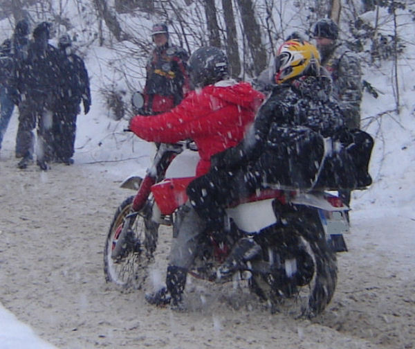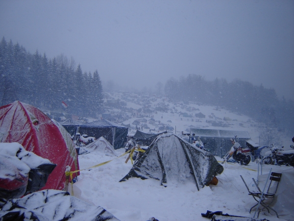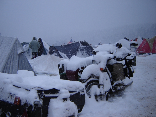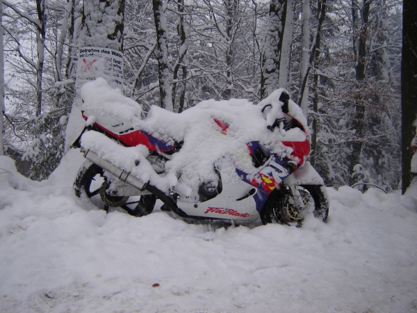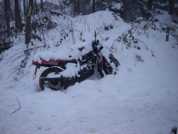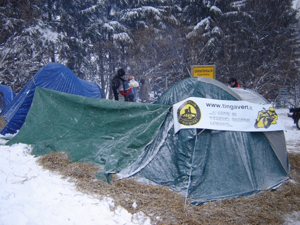 partenza venerdì mattina verso le 10.30 da milano, già in tangenziale la prima neve ed io diretto al temuto san bernardino! proseguo proseguo proseguo, la moto tiene (cagiva canyon 500), io mi adatto al mini posticino di guida perché carico come un mulo tra bauletto e zaino alla bella e meglio fissato al posto passeggero. ho la tenda, materassino, sacco, staff di pentolini e campin gaz per cucinare, pasta... ma do vado!? inoltre le moffole comprate il giovedì sera inizialmente mi sembrano un po' scomode ma faccio in fretta ad apprezzarne le qualità. la neve sul san bernardino rimaneva a terra e le uniche moto incontrate, un gruppo di 6, se ne tornavano indietro. ho pensato di spezzare il viaggio ad achberg, dopo lindau, dove ho un'amica. questo posto non è proprio sull'autostrada ed è finita che il villaggio l'ho trovato, ma la mattina seguente - ieri - prima la moto non ne ha voluto sapere di partire, olio ghiacciato, dei tedeschi mi hanno fatto entrare nella loro rimessa dove hanno acceso uno stufone, e poi ho fatto quei pochi chilometri nella neve sciandomela allegramente a rischio gambe. una caduta, una anche la sera prima, neve soffice più o meno. insomma altra nonnina tedesca molto gentile che mi fa rimessare la moto da lei, io torno dall'amica che gentilmente mi recupera, elefante sfumato. oggi un sole pazzesco e le strade buone, eccomi qui di ritorno. sono rimasto comunque contento, basta coprirsi bene e la moto è godibilissima anche d'inverno! al ritorno, dopo bregenz ero fermo a riposarmi e si è fermato l'unico altro motociclista incontrato, brianzolo credo, che veniva dall'elefante: "eravamo tutti impantanati lassù" mi ha detto e se ne è ripartito... ci rincrociamo quasi a como.
