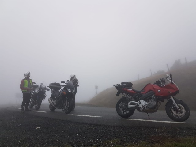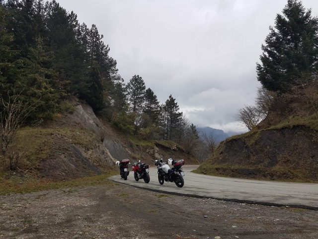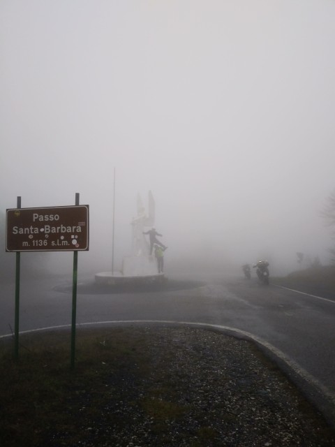 Usciamo da Voghera e risaliamo la valle Staffora fino a Varzi prima di trovare, finalmente, due curvette degne di tale nome. Peccato per le condizioni dell'asfalto, ma lo sapevamo già! Arriviamo comunque al passo del Brallo allegramente. Sosta veloce in cima senza nemmeno scendere dalle moto giusto per scambiarci le impressioni sulla strada e ripartiamo alla volta dell'Emilia Romagna e della Val Trebbia che raggiungiamo in quel di Ponte Organasco e risaliamo fino a Ottone. Qui iniziano le stradine, ci inerpichiamo infatti verso il valico del Pescino che raggiungiamo attraversando altri tre valichi "minori" percorrendo in costa alcune vallate laterali della Val d'Aveto rimanendo sopra uno strato abbastanza denso di nubi che staziona verso il fondovalle. Le strade finché si resta in Emilia Romagna sono discrete, al passaggio in Liguria diventano dissestate e scivolose. Al valico del Pescino fa qualche goccia di pioggia e la nostra sosta si riduce al minimo indispensabile per fare qualche foto.