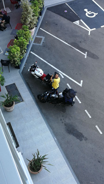Per fortuna a 100 metri dall'hotel c'è un concessionario KTM. Il buon uomo, capisce le problème e portata la moto in officina, dopo 5 minuti me la riporta con la catenella bella tensionata.