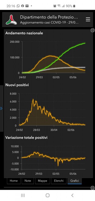 Nel grafico in alto la linea verde sono i guariti, la linea gialla gli attualmente positivi, e la linea bianca i deceduti.