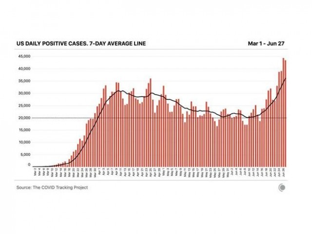 Tanto per tornare sul pezzo, i contagi negli Usa sono passati dai 20.000/giorno del 10/6 ai 45.000/giorno del 28/6.