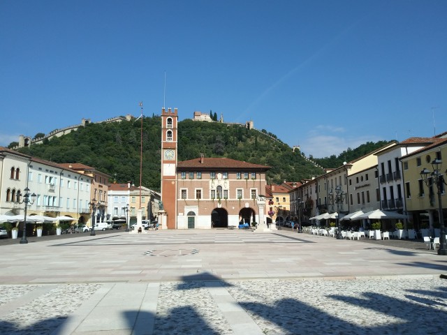 ) e proseguiamo fino a Marostica. Giunti nella città degli scacchi andiamo a cercare la famosissima piazza con la scacchiera, non prima di aver fatto una puntatina al castello superiore confidando in una vista panoramica (che c'era, ma sulla pianura sottostante).