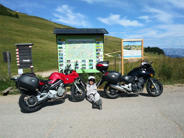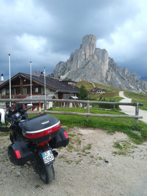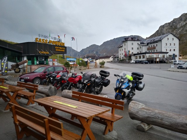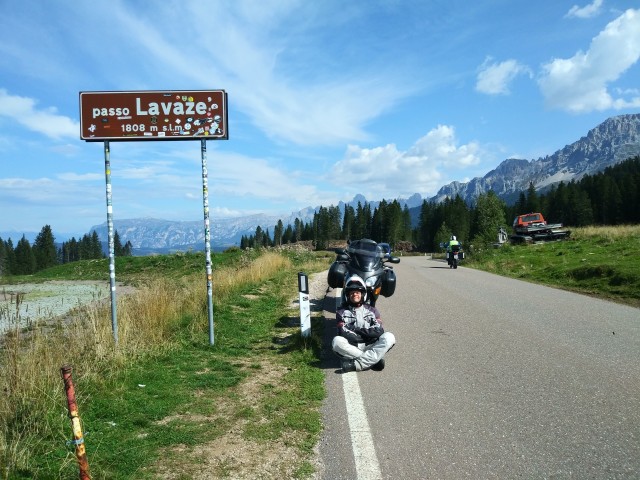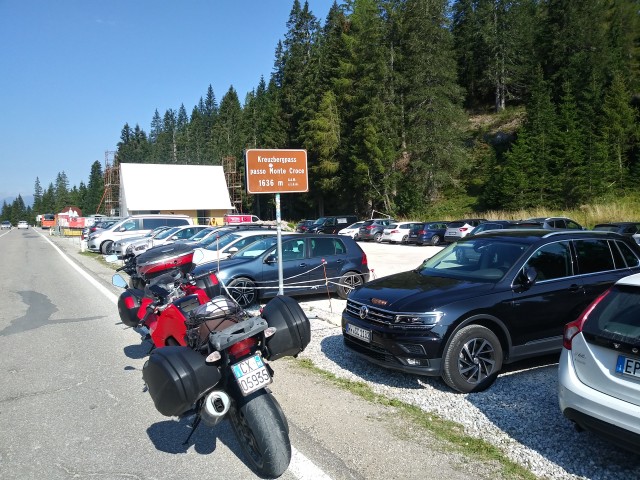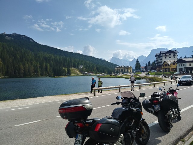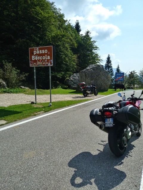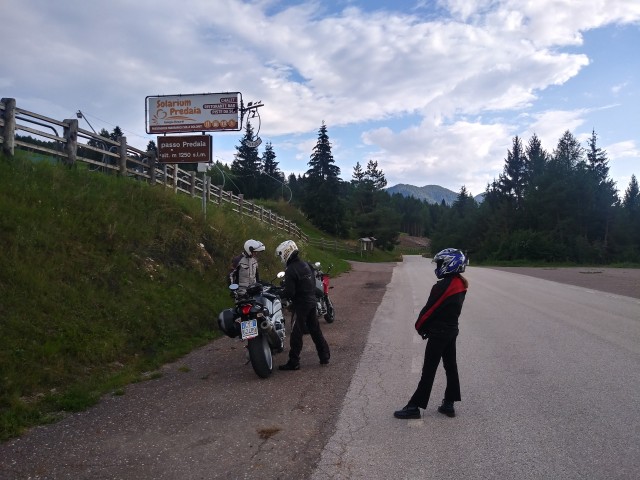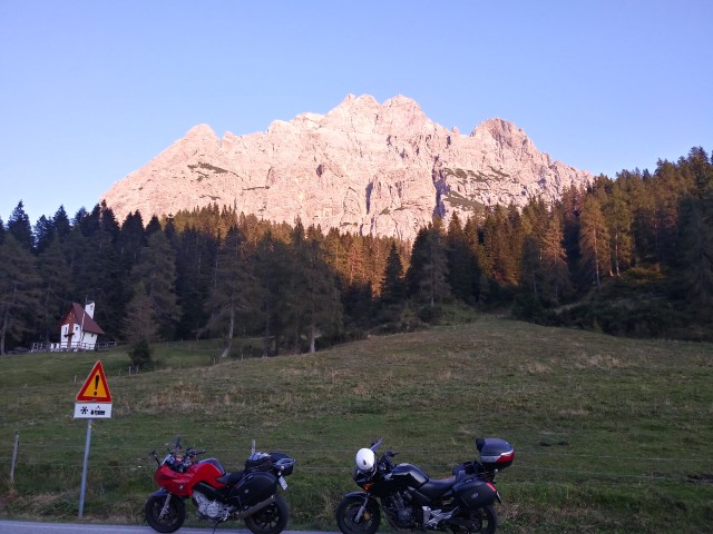 Qualche foto dove a spiccare sono il cartello del passo, le luci delle moto e gli inserti catarifrangenti dell'abbigliamento e di nuovo in sella che ci mancano gli ultimi chilometri verso Vigo di Cadore, dove abbiamo prenotato due notti in albergo. Al bivio per Vigo i navigatori, che finora ci avevano condotto in maniera esemplare, ci conducono lungo due strade differenti che però portano entrambe al nostro albergo che scopriamo essere "in the middle of nowhere"