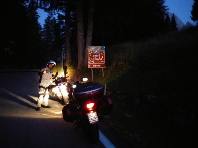 Ripartiamo dal passo che sono le 19 passate, è settembre e le giornate non sono più così lunghe, scendiamo in val zoldana e risaliamo verso il passo Cibiana. Scende la sera, non amo particolarmente guidare la moto con il buio su strade di montagna sconosciute, supero il disagio e proseguo, arriviamo al passo che è praticamente buio (anche perché la strada è in mezzo al bosco).