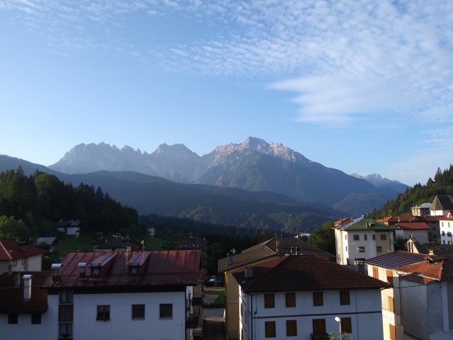 Tempo di una foto con le ombre lunghe e ci rimettiamo in marcia, per la Forcella Aurine raggiungiamo Agordo e la attraversiamo. La vista della sede di Luxottica mi fa tornare alla mente quando, una ventina di anni fa, ero qui per lavoro; in tutti questi anni l'azienda, che già era grande, è cresciuta ulteriormente continuando a rappresentare un punto di riferimento per il territorio.