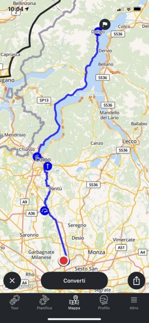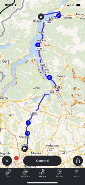 Fortunatamente l'app Calimoto che ho scaricato, una volta arrivato a Lentate mi ha fatto deviare per fare qualche curvettina e tornantino (poca roba ma meglio di niente).