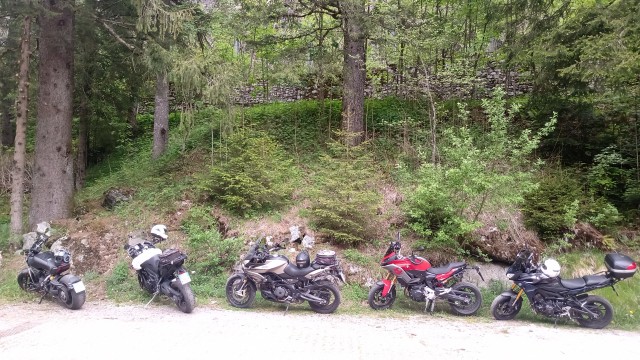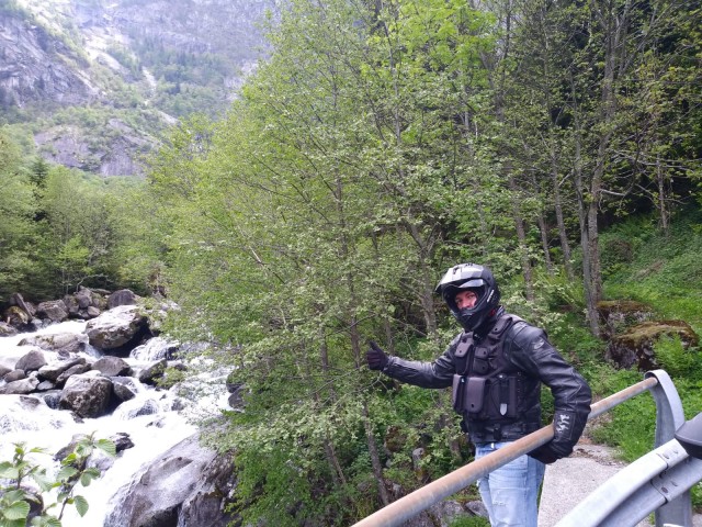 ), si costeggia il torrente con acqua mista bianchissima/ verde smeraldo fino alla fine della strada. Posteggiamo le moto alla meno peggio e cominciamo a camminare ma il posto è talmente bello che non sappiamo dove andare da tanto che c'è da vedere.. io opto per andare dove non c'è gente (la mia misantropia è nota ai più) ma il nuovo acquisto del tinga conosce il posto e ci porta a fare la camminata nel sentiero più civilizzato ma comunque semi deserto. Arrivati in un cuore di natura e immersi nel verde, ci buttiamo su un prato e riposiamo le natiche.. Purtroppo il tempo vola e dopo una mezz'oretta riprendiamo i ferri parcheggiati alla meno peggio e scendiamo a valle a motore spento nel silenzio più totale. Dopo aver fatto le ultime foto a un tornantone che da a strapiombo su una cascatella, accendiamo i ferri e ripartiamo per la Val di Mello e quindi fase conclusiva del giro ma al ponte del bivio ci accorgiamo che la strada è chiusa e quindi si prosegue da dove siamo arrivati. Da qui si rientra con calma e ci si ferma al distributore di Colico per i consueti saluti poiché qui le nostre strade si dividono causa esigenze varie.