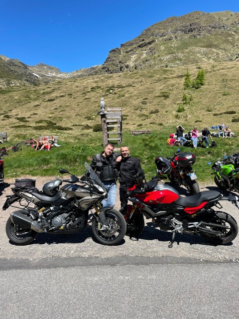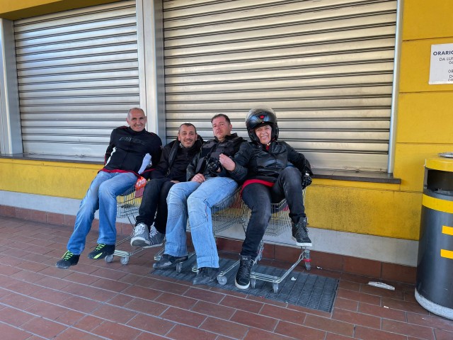 , dopo i saluti di rito partiamo direzione valli, tanto traffico e interminabili colonne fino alla Presolana, contenti che la coda sia finita e quindi finalmente pronti a fare qualche piega e far raffreddare i gruppi termici sotto le chiappe, dopo pochi km ci troviamo imbottigliati in una gara di ben 24 biciclette che ci fa perdere, come detto, 80 minuti, alla folle velocità di 19 km/h e conseguente bruciatura di maroni causa ventola di raffreddamento in modalità frullatore! 😰