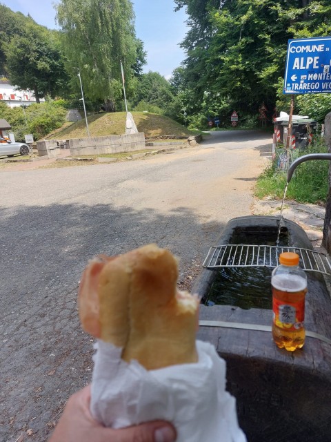 Poi dopo pochi km sono risalito su una stradina stretta e ripidissima, fino ad Alpe colle, dove mi sono fermato per un panino seduto su una fontanella dove c'era scritto "acqua non potabilizzata"