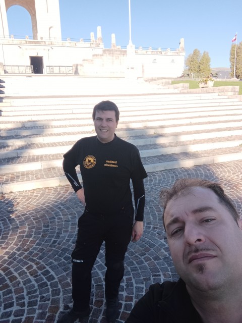 Dopo pranzo Roberto ci saluta per tornare verso casa e proseguiamo alla volta di Castello Tesino in due. Superata Rovereto tra traffico e lavori in corso, saliamo verso Folgaria e valicando i passi del Sommo e Vezzena entriamo nell'altopiano di Asiago (o altipiano dei Sette Comuni). Le strade sono magnifiche, il panorama di più. Arrivati ad Asiago ci fermiamo a salutare Maura, la morosa di Klaus che abita e lavora lì (e che domani ci raggiungerà al raduno) e non ci facciamo mancare nemmeno la visita al Sacrario Militare di Asiago (Ossario del Leiten) per dare un'impronta culturale al nostro motogiro.
