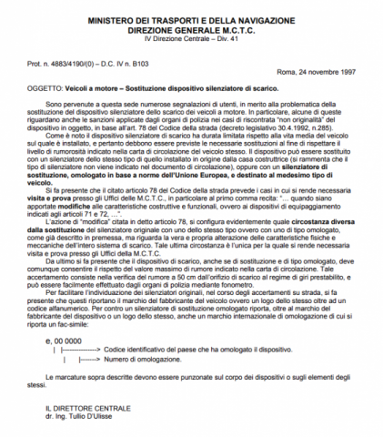Oggetto: omologazione scarichi, annosa questione sempre al pelo legge