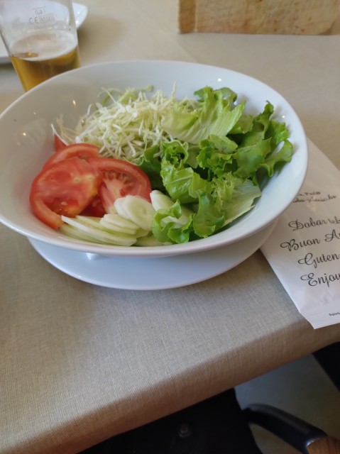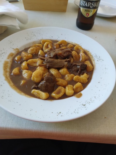 Riposo del guerriero presso Konoba Jelenic, gnocchi con sugo di selvaggina, insalata mista, birra e caffè a 20 euro.