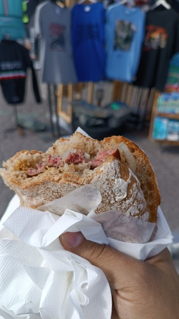 Mi fermo in un barettino per fare colazione. Mentre io mi gusto brioche e succo di frutta, la Gilda di gusta il panorama floreale.