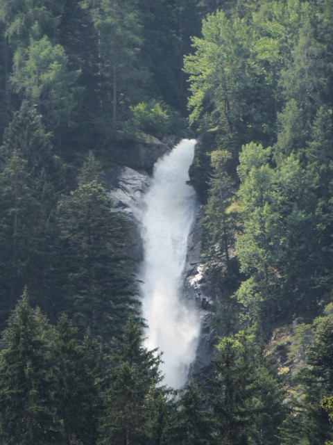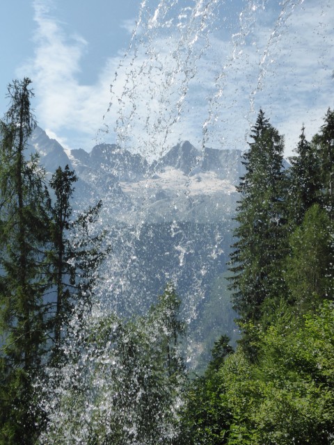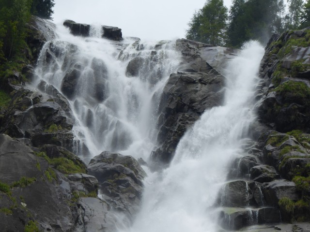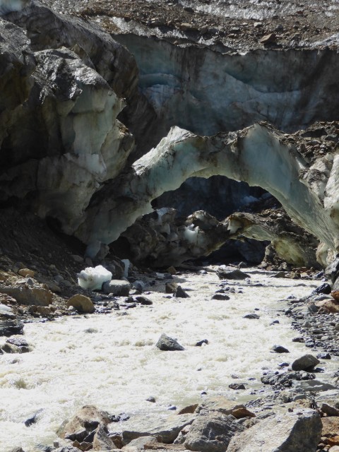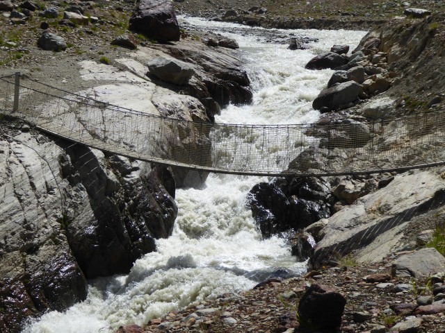 Attraverso il primo ponticello tibetano e tengo la destra per andare verso il Ghiacciaio dei Forni. Dopo diversi minuti, arrivo al torrentello da attraversare per raggiungere la bocca del ghiacciaio, ma visto che ci sono da fare due salti sulle rocce umide, non vorrei scivolare e rovinarmi la vacanza... ritengo più sicuro usufruire dello zoom della mia compattina.