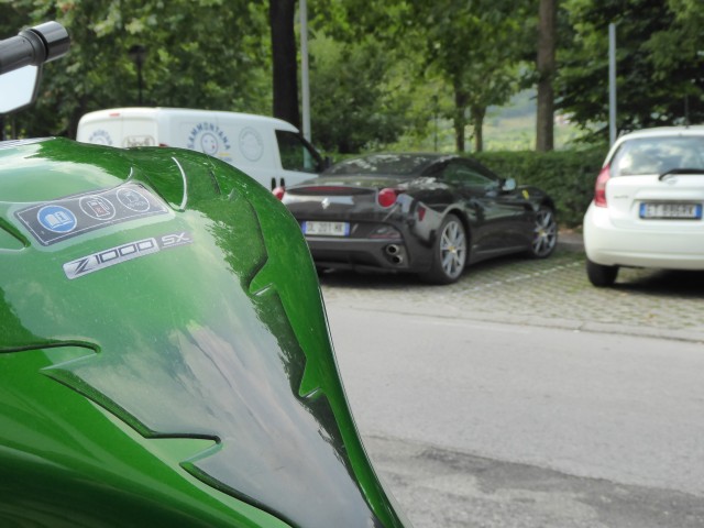 Scendo a Idro che mi sto sciogliendo, così mi fermo per un ghiacciolo in riva al lago. Al momento di ripartire, mi viene un dubbio Amletico: meglio tornare con la Kawa o con la 812 Superfast?