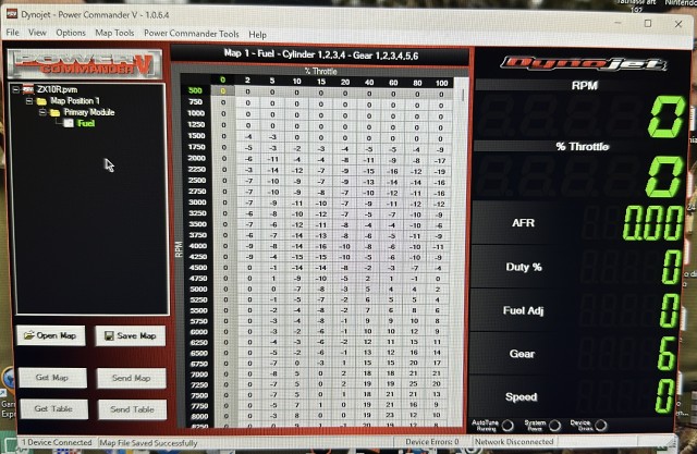 Ho montato uno scarico completo , filtro standard e PowerCommander V fuel Injection. Come da configurazione della mappa dynojet installata sulla centralina, installata precedentemente dall'ex proprietario della centralina ( era su un'altra moto , ma con medesima configurazione) quindi semplicemente ho preso la pcv usata e l'ho montata sulla mia moto.