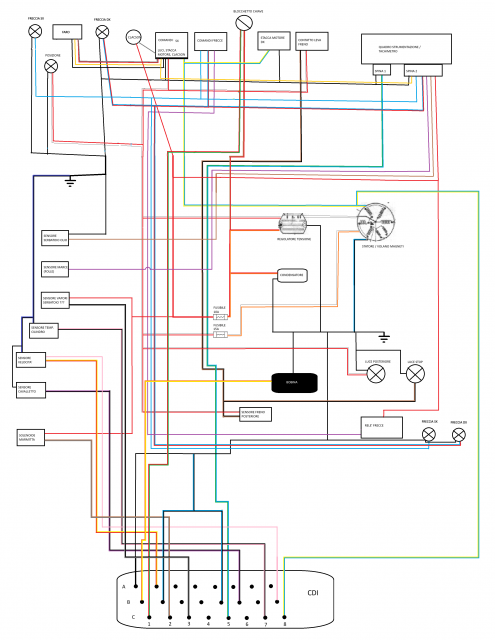Tra le tante modifiche in cantiere decise col pargolo, vorremmo istallare l'avviamento elettrico. Per farlo avevo bisogno dello schema elettrico originale, ma non c'è stato verso di trovarlo in rete o farselo dare da qualche meccanico. Alla fine ho deciso di smontare la moto, aprire la treccia in un paio di punti e "leggere" l'impianto elettrico dal vivo ricavando uno schema. Spero possa essere utile anche ad altri.